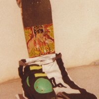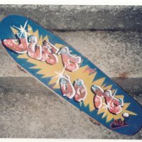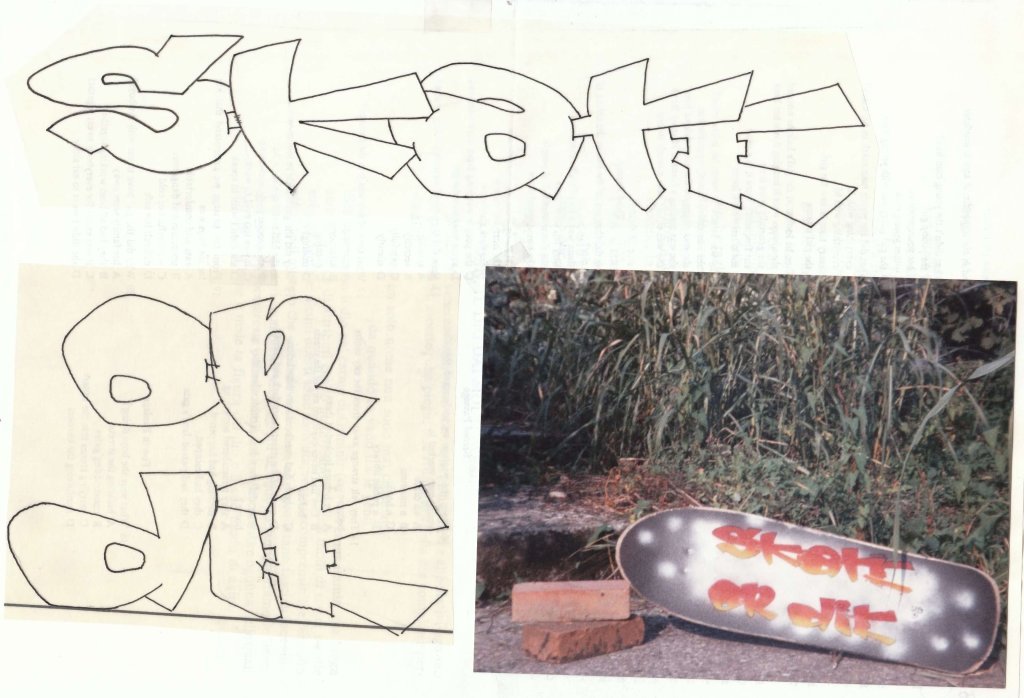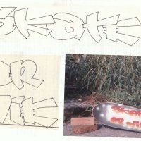 Ci fu anche qualcuno che mi chiese un’opera su commissione, un enorme poster, prontamente realizzato. Decorai anche qualche maglietta e vari skateboard, come si vede nelle prove fotografiche qui sopra...